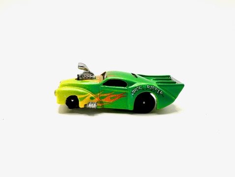 I like this car. Green with yellow to orange flames (how flames should be done). 4-gear with drag meats that fit under the quarters